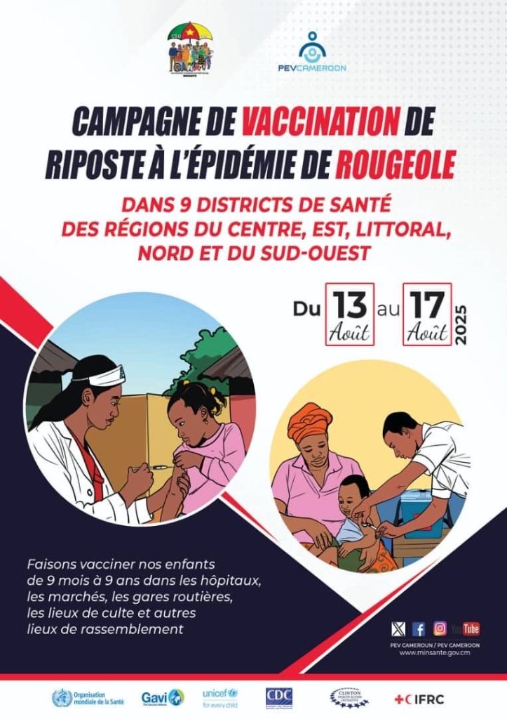 C’est pourquoi le Programme Élargi de Vaccination (PEV) et le Ministère de la Santé Publique, avec l’appui de leurs partenaires, organisent du 13 au 17 août 2025 une campagne de vaccination de riposte dans les régions du Centre, Est, Littoral, Nord et Sud-Ouest.